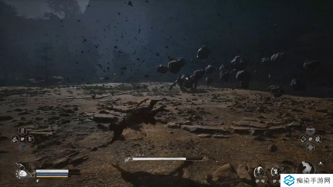 波浪浪震地,扬起石头进行射击,此时会停止行动,我们向他射击的空挡躲避就行。