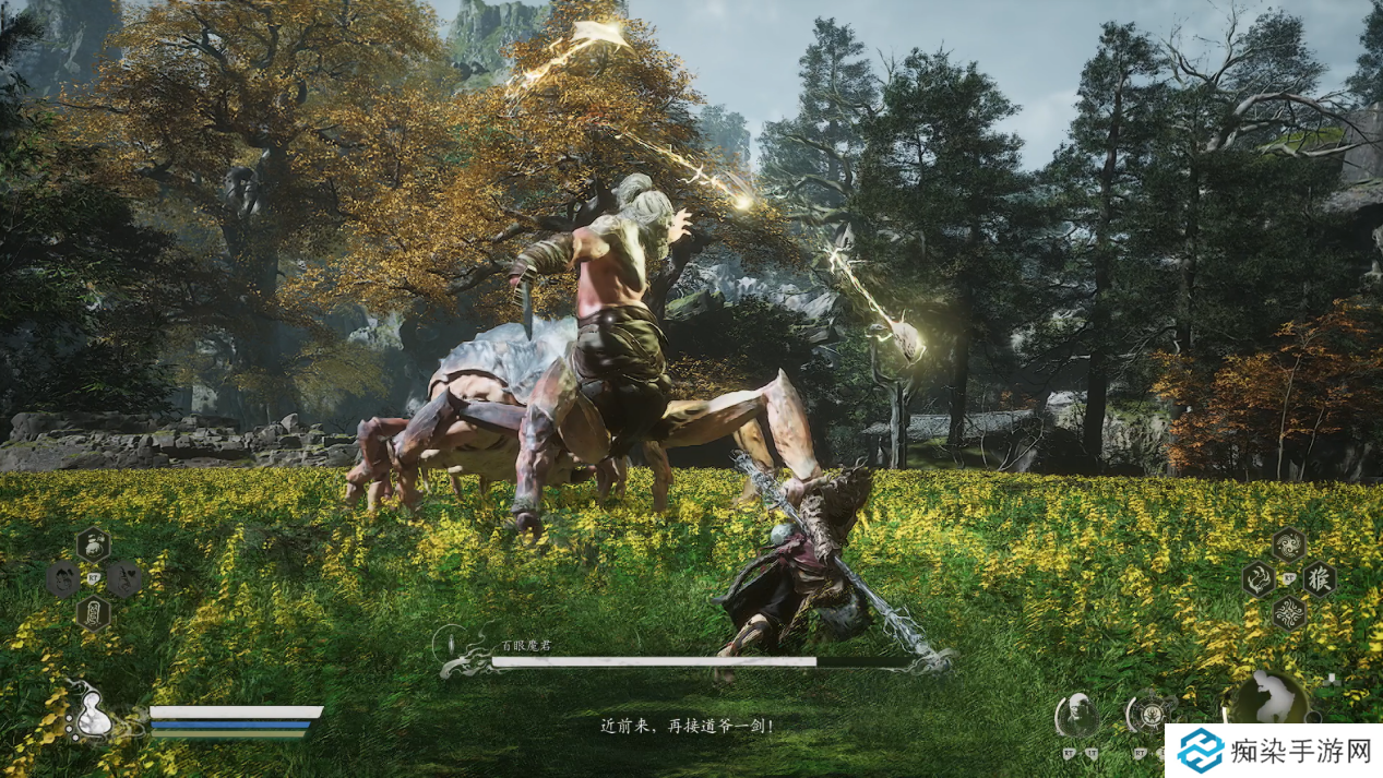 蓄力聚集金光雷法御剑,然后用剑直刺,此招式注意要保持向百眼毒君出招的反方向移动,不然吃到一击很伤。