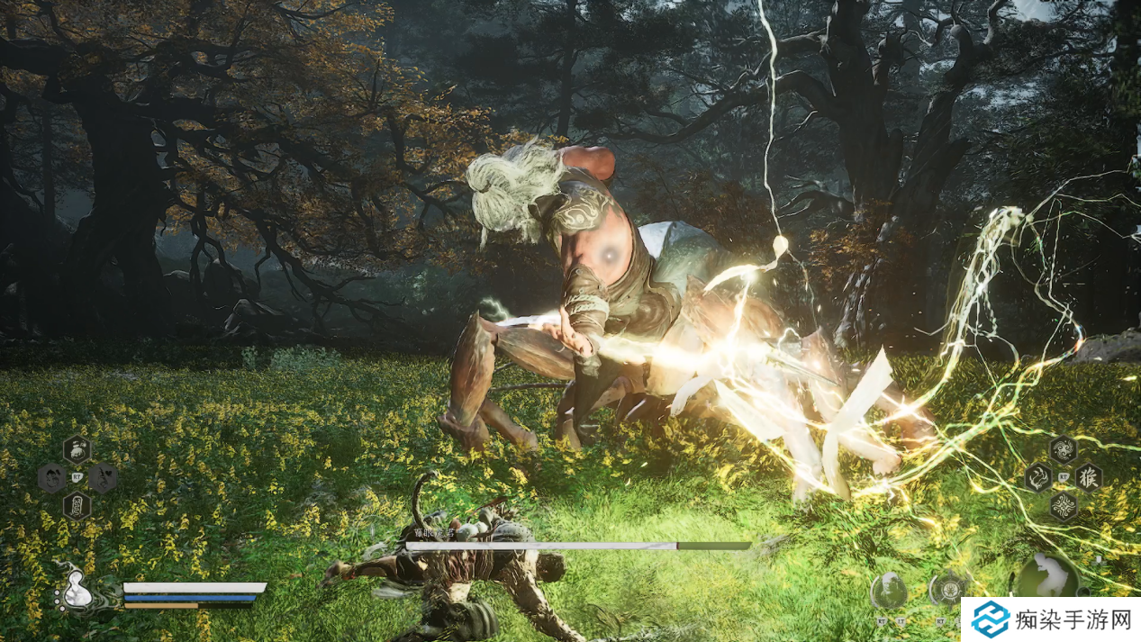 百眼毒君挥动雷符打出三下雷电伤害,紧接着再用剑攻击,百眼毒君的近身攻击很麻烦,有快慢刀,基本上每一刀都会停顿一下再出招,翻滚很吃时机,小编建议滚到百眼毒君的左右两侧比较安全。