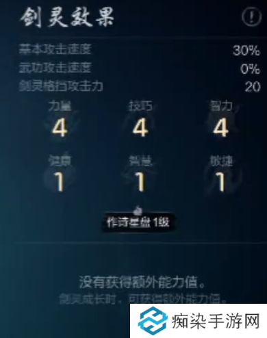 这剑灵的话可以带来高额的基础属性加成,首先佩戴上它之后就可以获得30%的攻击速度。然后格挡方面的攻击力也会提升20%,所以用了它之后。能让你的基础作战能力提升一个台阶,然后力量,技巧,智慧都会提升四点,更加均衡。