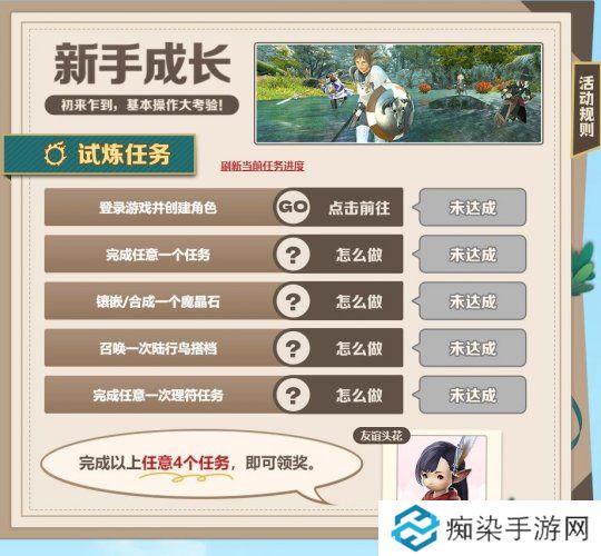完善的游戏引导!刚刚创建角色的新人冒险者在活动页面中找到《新手成长》的版块,在其中就有完善的游戏指引!点击问号旁的“怎么做”即可获得相关攻略指南!