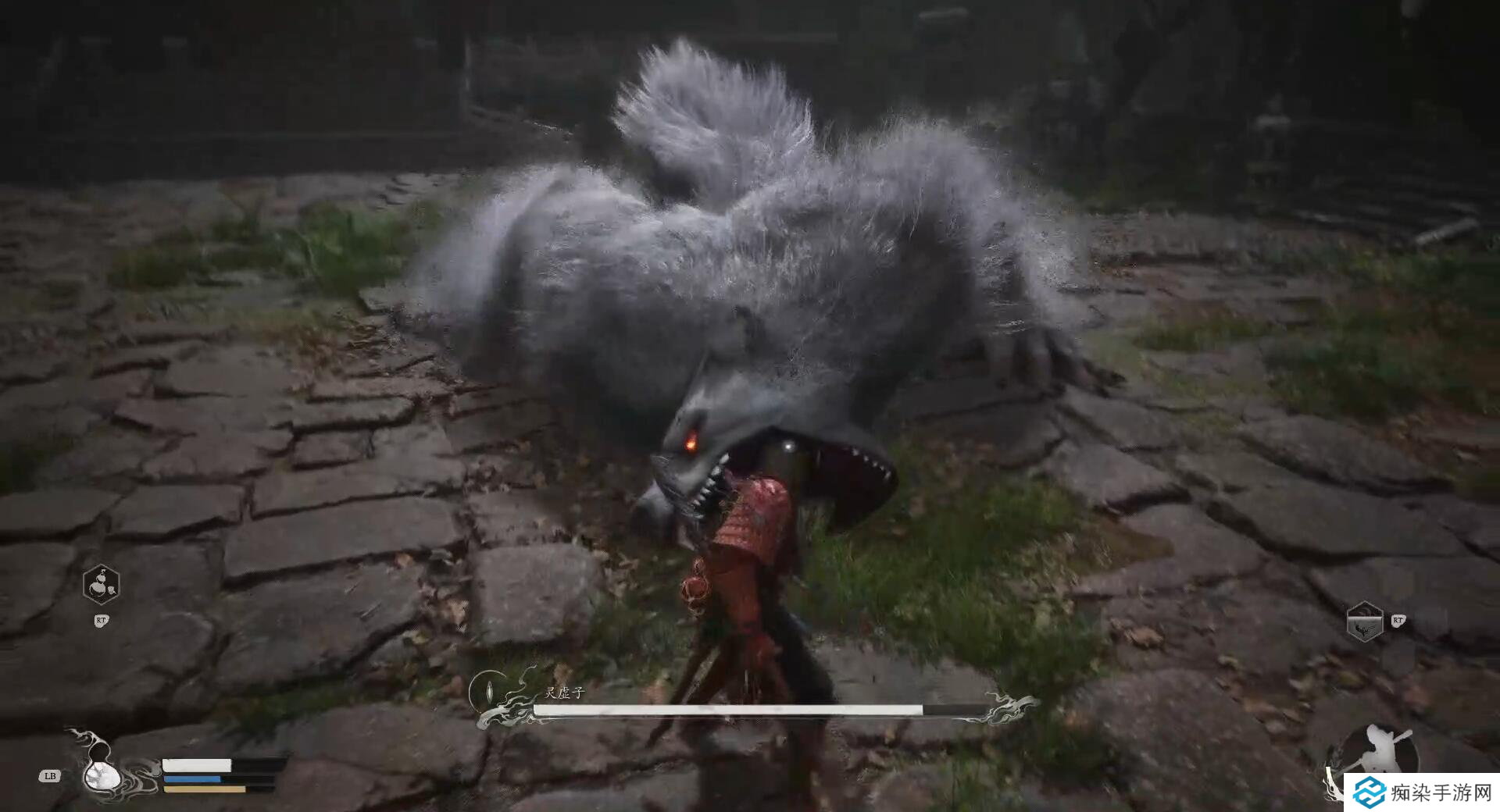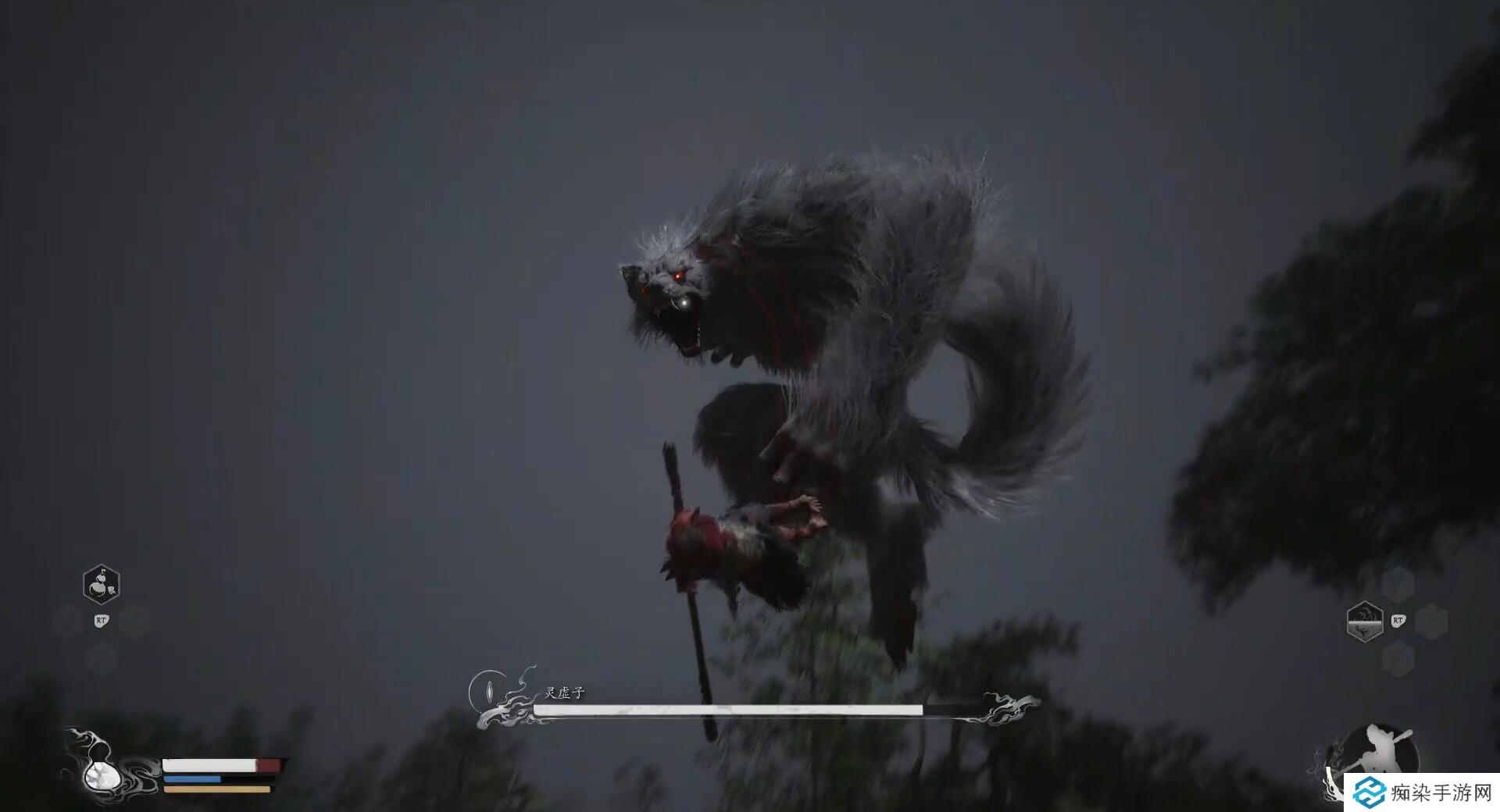 应对讲解:如果不慎中此招,在boss将我们从空中砸向地面后,第一时间远离自己的掉落位置(奔跑+闪避皆可),因为投机后灵虚子会接一个伤害极高的啃咬动作,不过动作较慢,还是比较好躲过的。