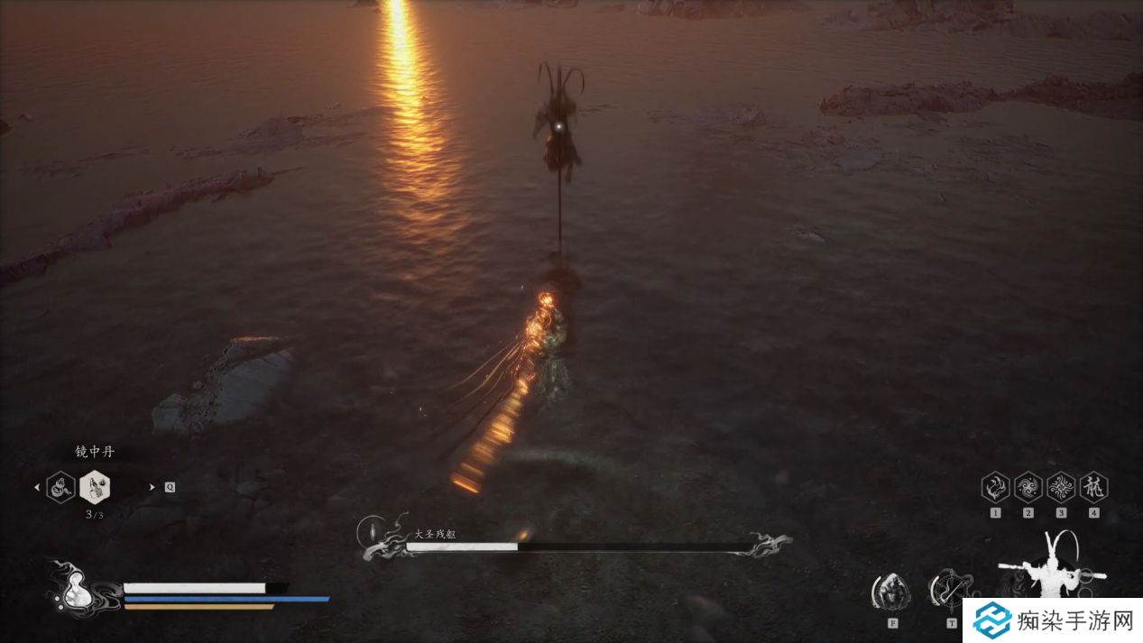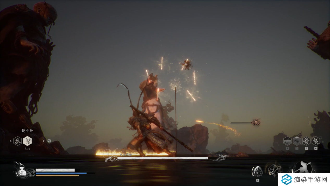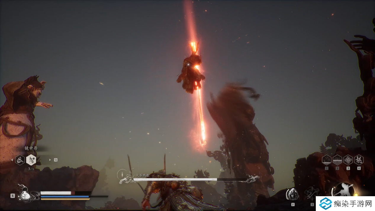 大圣的轻攻击与我们几乎一样,但是棍子更长,且它还会翻滚,小编建议此时我们就不停移动不要靠近猴哥,用四段棍式的长距离攻击消耗即可,并且多保留一点血瓶和法术值作二阶段的最终决战。