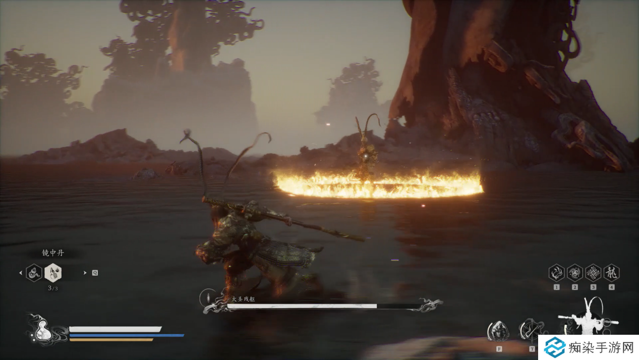 大圣画地为牢,画出的安身法是我们的几倍,我们靠近火圈就会受到伤害,等他出了安身法后再寻攻击的时机,或者使用四段的大范围劈棍中距离攻击。