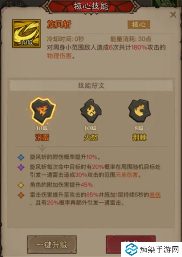 核心技能:旋风斩——滚雷核心输出技能,制造大量雷电伤害