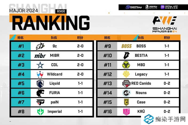上海Major美洲RMR首日比赛已经告一段落,首日进行了两轮瑞士轮BO1的比赛,其中9z、MIBR、Complexity、Wildcard均拿下了两连胜的好成绩,以下为今日赛果、明日预告和积分图一览。