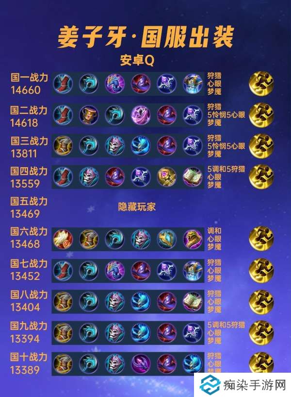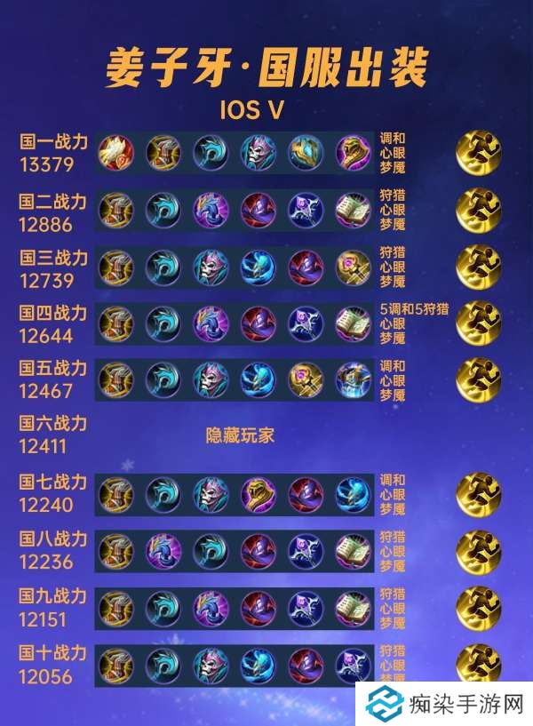 先做一个统计,40位国服姜子牙中有4位是走辅助位的,其余除隐藏玩家外都是走中路的。
