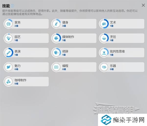 技能:后期小人自主提升的能力,如烹饪技能在小人做饭时得到增长,技能等级的提升会影响到小人的