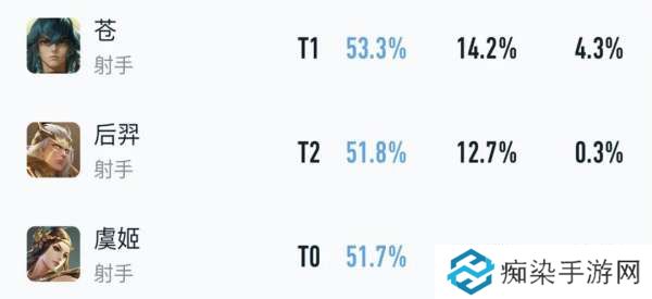 巅峰赛禁选率>5%胜率前三射手英雄: