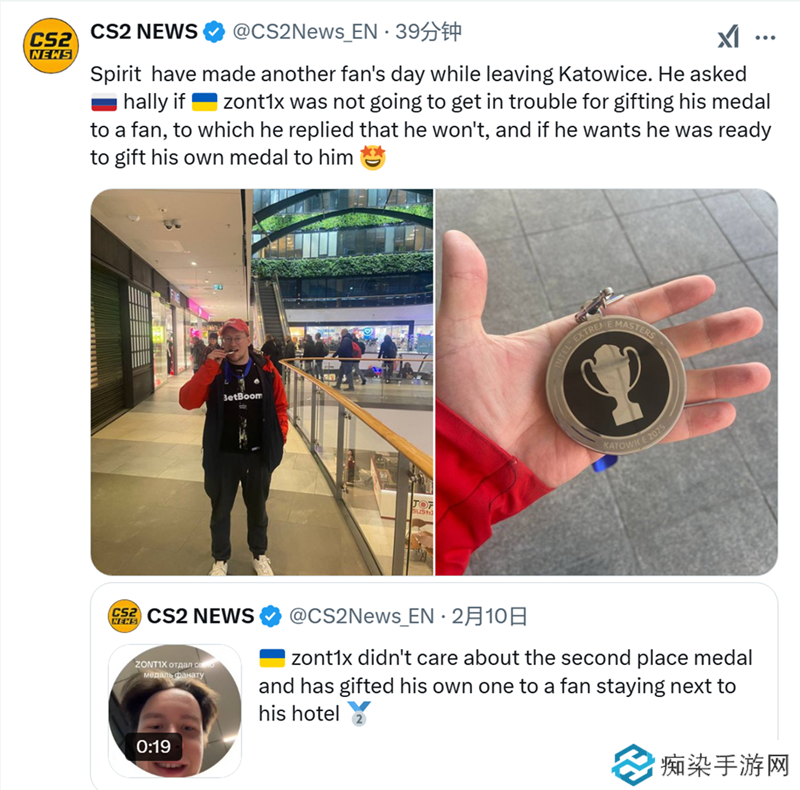 在IEM 卡托维兹 2025决赛不敌Vitality未能卫冕之后,Spirit选手zont1x在赛后将自己的亚军奖牌赠送给了一位粉丝。