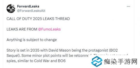 根据推主@FumoLeaks爆料,《使命召唤2025》故事设定在2035年,主角是《黑色行动2》主角David Mason,一些次要情节将被重新设定。仍然是谍战,类似于《使命召唤17:黑色行动冷战》和《使命召唤21:黑色行动6》