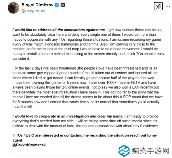在过去的两天里,我受到了威胁,我的家人也受到了威胁,这一切都是因为有人剪辑了我四轮表现良好的片段,这些片段都被断章取义,怎么不把我白给的时候也剪下来呢?我完全可以以这种方式指控一半的玩家。我已经玩这款游戏五年了,在HLTV上有超过1000张地图的记录,并且一直参加那些二级和三级的线上赛事,更不用说我们最近还赢得了一个线下赛,但这绝对是我遇到过的最荒谬的情况。事情已经发展到我的家人都在担心的地步。