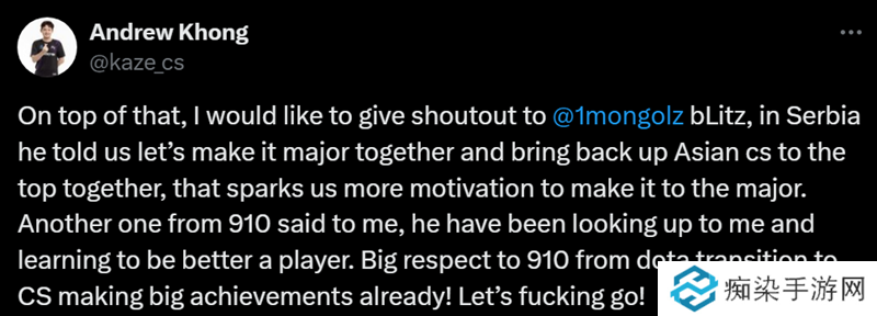 “此外,我还要向bLitz致敬。在塞尔维亚,他告诉我们说让彼此一起打进Major,一起将亚洲CS重新推向顶峰,这让我们更有动力打进Major。另一位蒙古队员910对我说,他一直都很钦佩我,并在学习成为一名更优秀的选手。非常尊重910从dota转战CS,并且已经取得了很大的成就!一起加油吧!”
