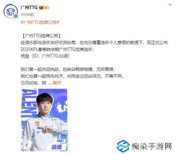 【广州TTG挂牌公告】经俱乐部与选手友好交流协商,在充分尊重选手个人意愿的前提下,现正式公布2025KPL春季转会期广州TTG挂牌选手:杨垒(ID:广州TTG.仙语)我们曾一起共迎挑战,在峡谷畅游驰骋,无所畏惧;我们也曾一起同舟共济,共同走过低谷浮沉,不离不弃。日月如梭,我们共同谱写了诸多故事,或是高光,或有失意。但一直以来,我们始终怀揣着同一个目标坚定向前。我们坚信星星会一直闪耀,金子也一定会发光。感谢仙语选手在队期间的辛勤付出,他的汗水和努力构成了我们彼此独一无二的回忆。长风破浪会有时,直挂云帆济沧海。不论结果如何,衷心祝愿仙语选手前程似锦!在未来的职业生涯中,继续发光发热!