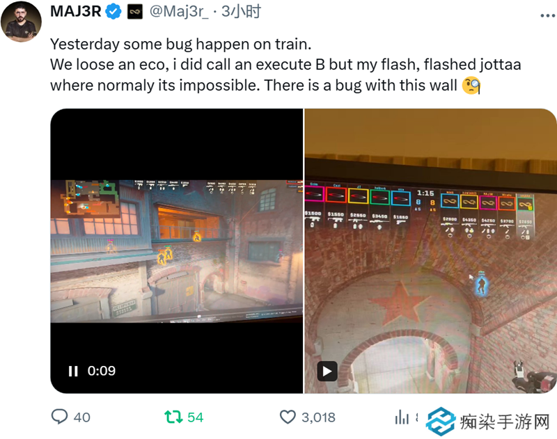 他查看的是IEM 卡托维兹站入围赛EF和Complexity的比赛demo。当时在Train地图上,EF战队打算从B斜坡发起进攻。但MAJ3R丢出的高闪却意外致盲了尚未走出斜坡的队友Samet Köklü | jottAAA。从回放中可以明显看到这颗闪光正常情况下绝无理由可以致盲JottAAA。MAJ3R认为这面墙有BUG问题。