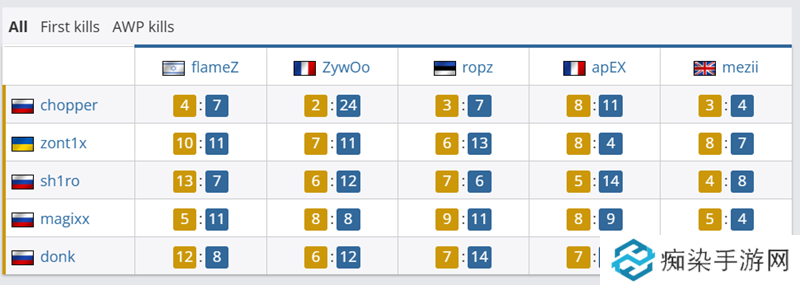 在全部对位数据上,我们可以看到一个夸张的数据:ZywOo 24-2 chopper。ZywOo对位Spirit的所有队员都不处于下风,除了与magixx战成8-8平外,其他人都没能与ZywOo抗衡。Spirit的明星选手donk只在与flameZ的对决中占据优势,其他都是战平或处于劣势。