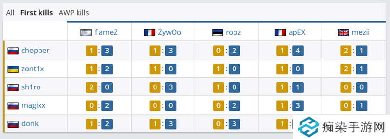 在首杀方面,ZywOo取得9个首杀,与flameZ、apEX并列第一。donk则取得了7个首杀。magixx只有一个首杀入账。