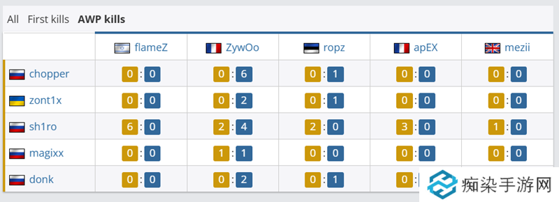 狙击枪击杀方面,ZywOo与sh1ro分别取得了15个和14个狙杀数,二者对位中ZywOo以4-2领先。