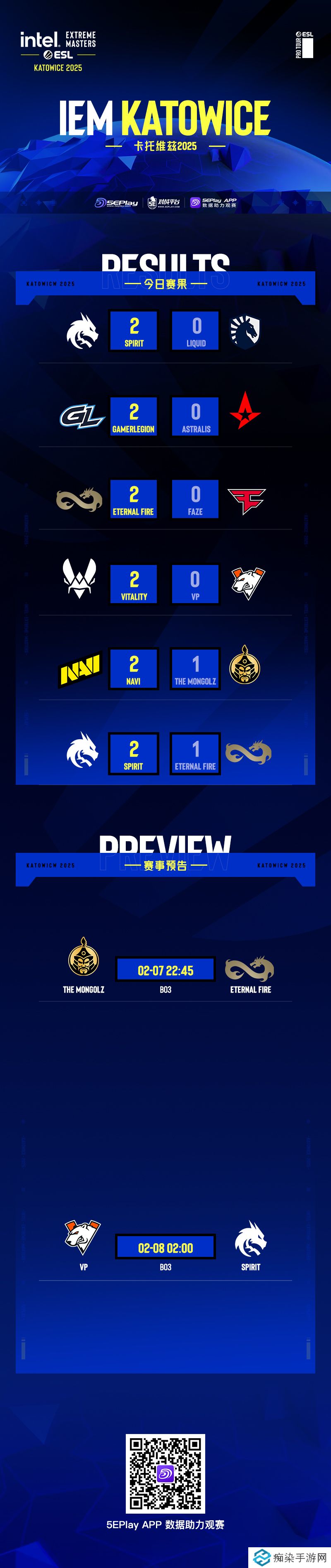 IEM卡托维兹 2025小组赛正式结束,在最后一个小组赛比赛日中,Eternal Fire、Spirit搭上了前往淘汰赛的末班车,Liquid、FaZe、GamerLegion、Astralis遭到淘汰,Vitality与Natus Vincere则是来到了半决赛的舞台。淘汰赛将于2月7日正式开始,1/4决赛率先进行,The MongolZ将迎战EF、Virtus.pro对阵Spirit。以下为今日赛果、1/4决赛预告一览:
