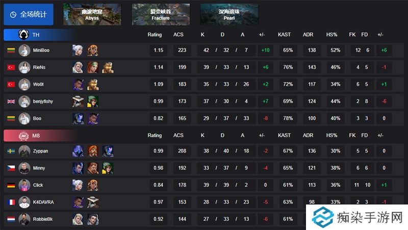 回到比赛,图一幽邃地窟,TH 4:13 M8,图二裂变峡谷,TH上半场直接一波11:1拿到胜势,比分最终锁定在TH 13:3 M8,图三深海明珠,TH 13:8 M8。MiniBoo选手拿到了全场最高的42总击杀。