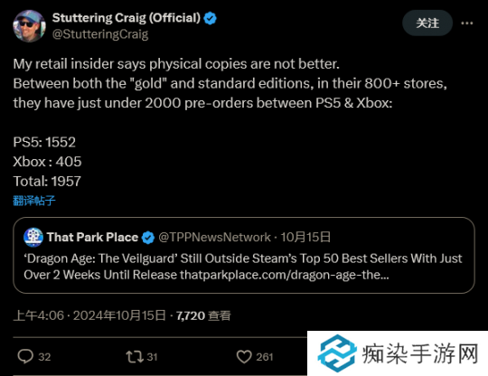 据游戏资讯播客 Side Scrollers Podcast 所有人 Stuttering Craig 在推特上分享,他从零售业内人士处获得消息,《龙腾世纪:影障守护者》在 PS5 和 Xbox 平台的实体总预订量仅为 1957 份。其中 PS5 为 1552 份,Xbox 仅有 405 份。这是包含了游戏的基础版本和高级版,涵盖了 800 家商店。