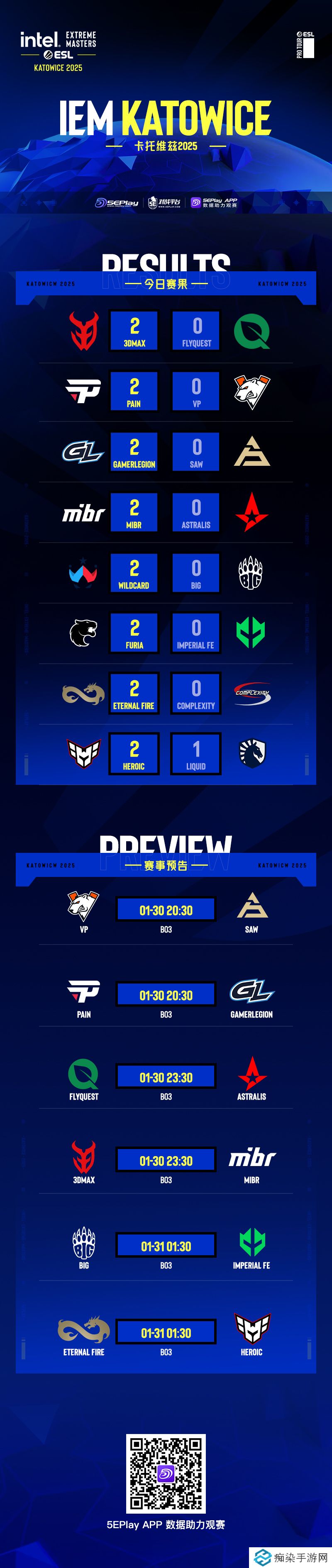 IEM卡托维兹 2025入围赛首日比赛已经告一段落,在首日比赛中,3DMAX、paiN、GamerLegion、MIBR、Wildcard、FURIA、Eternal Fire、HEROIC均取得胜利,Astralis、FlyQuest、Virtus.pro、SAW、BIG、Imperial fe、Complexity、Liquid则是掉入败者组。明日将会有VP和SAW、A队和FQ、BIG与Imperial fe的生死局上演!以下为今日赛果、明日预告一览: