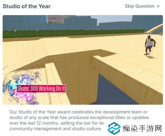 金摇杆奖“年度游戏开发商”的说明是庆祝过去12个月以来任何规模的开发团队/工作室,这些工作室推出了“超绝的游戏/更新”,“为技术最佳案例、社区经营和工作室文化设置了标杆”。