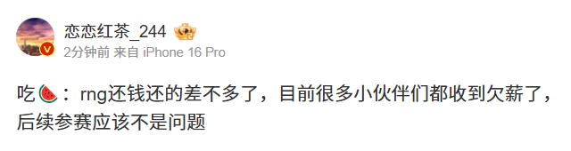 今日恋恋红茶爆料RNG还钱以及还的差不多了,目前很多小伙伴们都收到欠薪了,后续参赛应该不是问题!