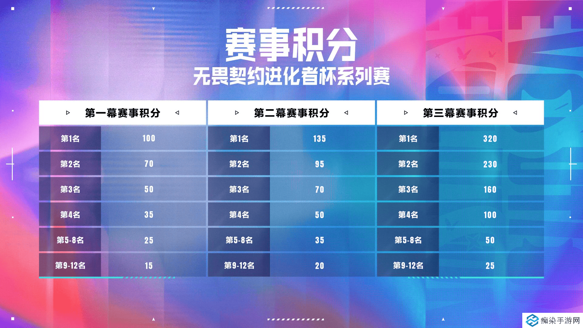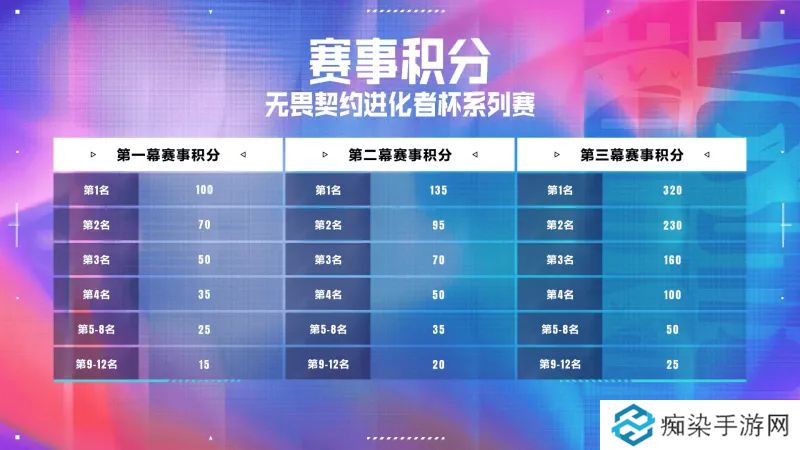 所有参赛队伍将根据赛事名次获得无畏契约进化者杯系列赛赛事积分。参赛队伍将在三幕比赛中,基于赛事名次获得进化者杯系列赛积分,最终积分靠前的队伍将参加进化者杯系列赛终章。