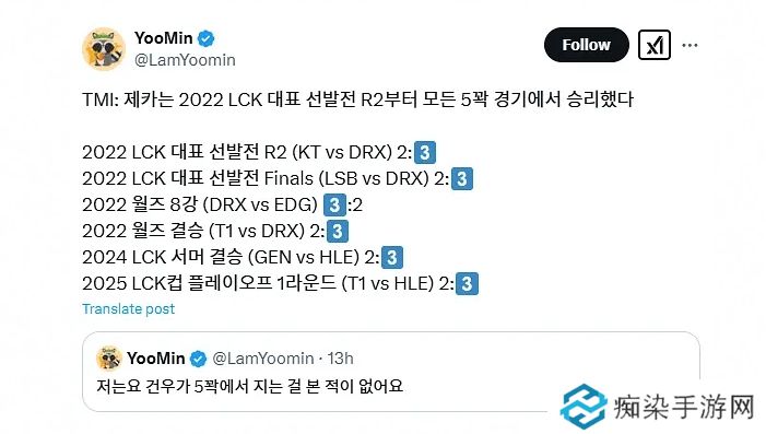 直播吧2月14日讯 LCK杯季后赛HLE三比二淘汰T1,值得一提的是HLE中单Zeka从2022年开始就没输过BO5第五局。