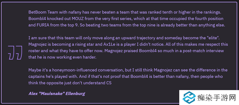 也许这只是蜜月期的影响,但我依然认为Magnojez能看出他所经历的队长之间的差异。如果这还不足以证明Boombl4比nafany更强,那么那些认为相反的人就根本不懂CS。”