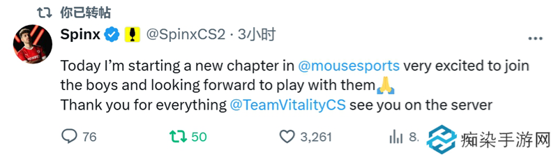 Spinx:今天我在MOUZ战队开启新篇章。能加入这群伙伴,我兴奋不已,期待与他们并肩作战。