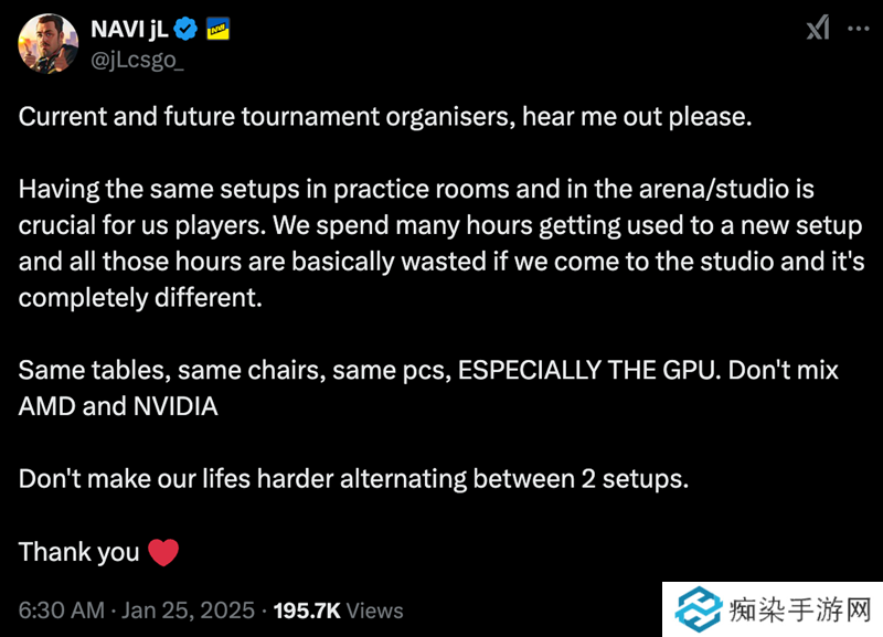 Natus Vincere战队步枪手jL发布动态,请求赛事主办方保持训练室和比赛电脑的配置和设置一致。