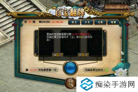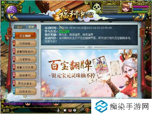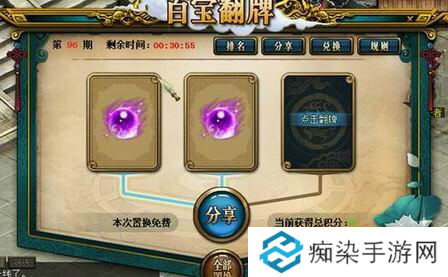 活动期间,可以在游戏界面右上角点击“福利”找到“百宝翻牌”按钮参与活动。通过将三张牌凑成同一图案,可以赢得元宝、道具、积分等奖励。通过同时置换三张牌,或者在两张牌已经相同的情况下,单独抽取第三张牌来完成整个图案。参与活动的首次置换完全免费,每15分钟还能获得一次免费置换三张牌的机会。