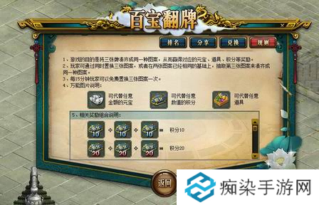此外,玩家还可以在分享页面获取他人分享的两张相同图案。当玩家的翻牌状态处于A+A+B的状态下,就可以进行分享操作,分享后将额外获得积分奖励。每位玩家每日最多可分享20次,每日最多可获得200点积分,这些积分可用于兑换超级神兽丹、道具套餐卡、超级绿水晶等多种实用道具。在百宝翻牌环节中,还有概率翻出万能图片,它能够代替任何置换图片使用。
