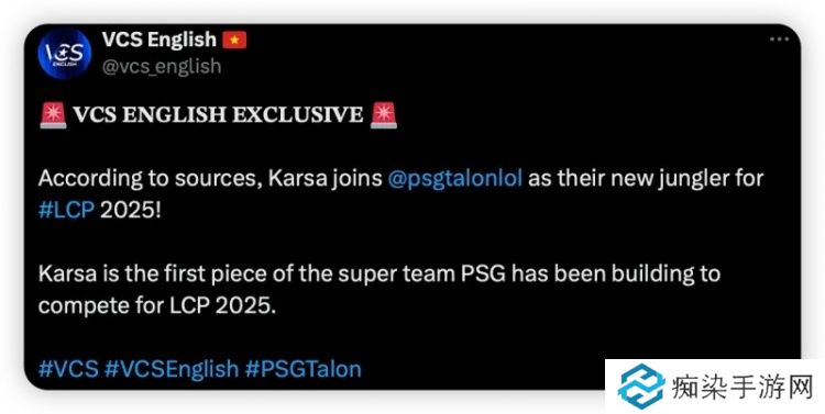 直播吧11月22日讯 VCS英文推特账号官宣,打野选手Karsa将加入PSG担任他们2025年参加LCP联赛的新打野。