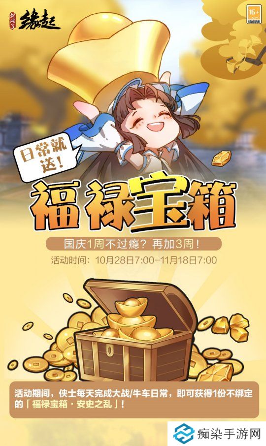 10月28日7:00-11月18日7:00,持续三周!只需完成日常任务即可获得1份「福禄宝箱·安史之乱」。开前摇一摇,说不定能开出「沉沙玄晶」、「化玉玄晶」或者「飞仙玄晶」哦!