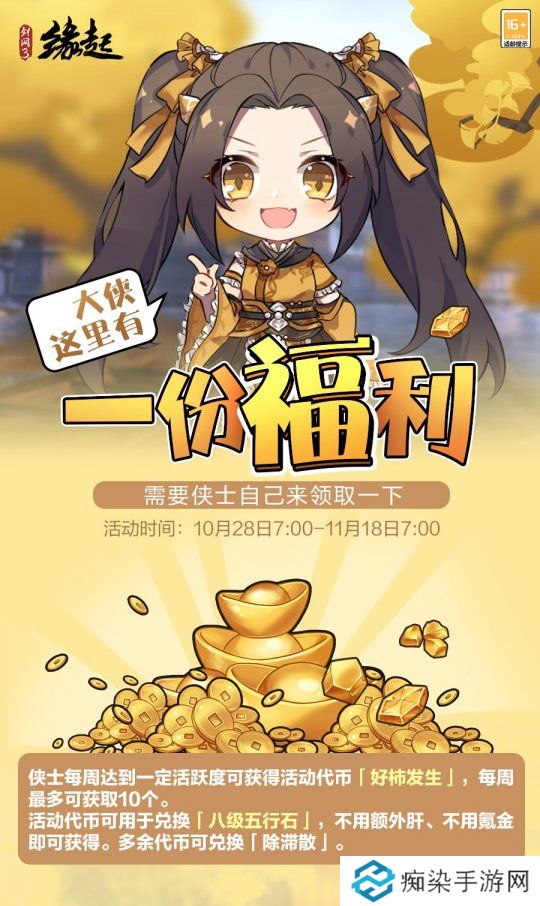 侠士快看!这里有一颗「八级五行石」等你来领取!10月28日7:00-11月18日7:00,侠士在游玩时,积累到一定数值的活跃度即可获得活动代币「好柿发生」用于兑换「八级五行石」。不用氪金,不用额外做活动!