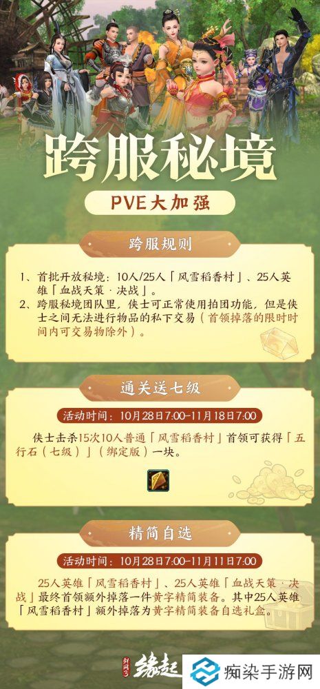 大家日思夜想的跨服秘境终于来了!首批开放跨服功能的秘境有:10人/25人「风雪稻香村」、25人「血战天策·决战」,活动期间内还有「七级五行石」和「黄字精简装备自选礼盒」掉落!更多详情请看下图。