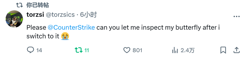 “拜托了,CounterStrike,救救我的蝴蝶刀,恢复切枪后立刻检视吧。”