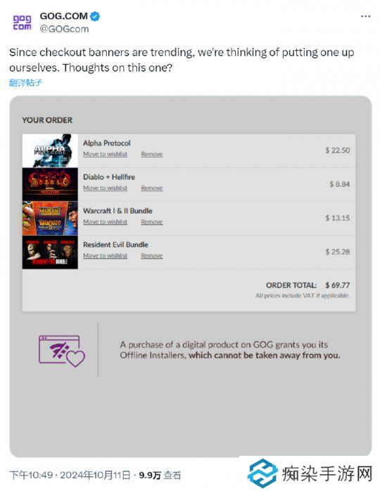 此次,Steam在用户协议中明确指出“玩家只有游戏的体验权”这点后,另一个游戏平台GOG乘势进行了补充发言,为自家平台打起了广告。因为在GOG购买的游戏,都能够进行离线安装。玩家购买后,真的能够永久使用下去。
