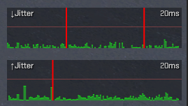 每个图表中间的红线是警告阈值,超过该阈值的抖动更可能导致错过tick。阈值取决于当前手动缓冲量(通过设置 > 游戏 > 缓冲设置,以消除数据包丢失/抖动)。如果数据包在此行上方抖动并变为红色,则表示抖动量相对于当前手动配置的缓冲量较高。这并不一定意味着丢失了tick并影响了游戏操作。