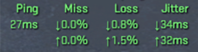 “ping” 和 “miss” 列显示与基本视图中相同的信息。 “Loss” 表示丢包,“jitter” 表示峰值抖动。 在此示例中,尽管存在数据包丢失和严重抖动,但tick丢失率(Miss)仍为0%,因此游戏体验不应受到影响。