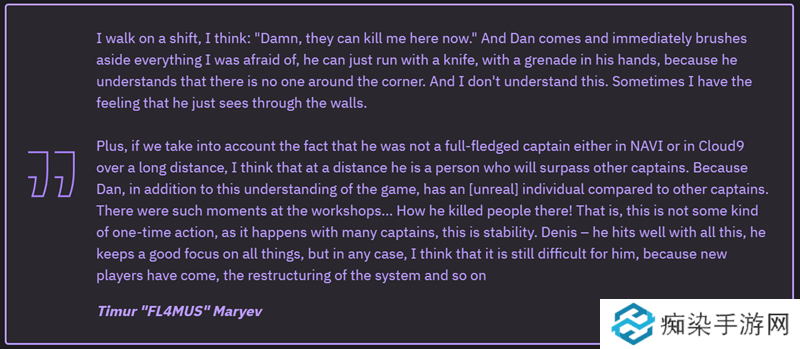 “我在转点的时候会想:‘该死,他们现在可能会杀了我。’然后electroNic就过来了,立刻把我担心的事情都扫除掉,他甚至可以拿着刀,手里拿着手雷跑过来,因为他知道角落里没有人,而我理解不到这一点。有时候我有一种感觉,他就像能透过墙壁看人一样。”