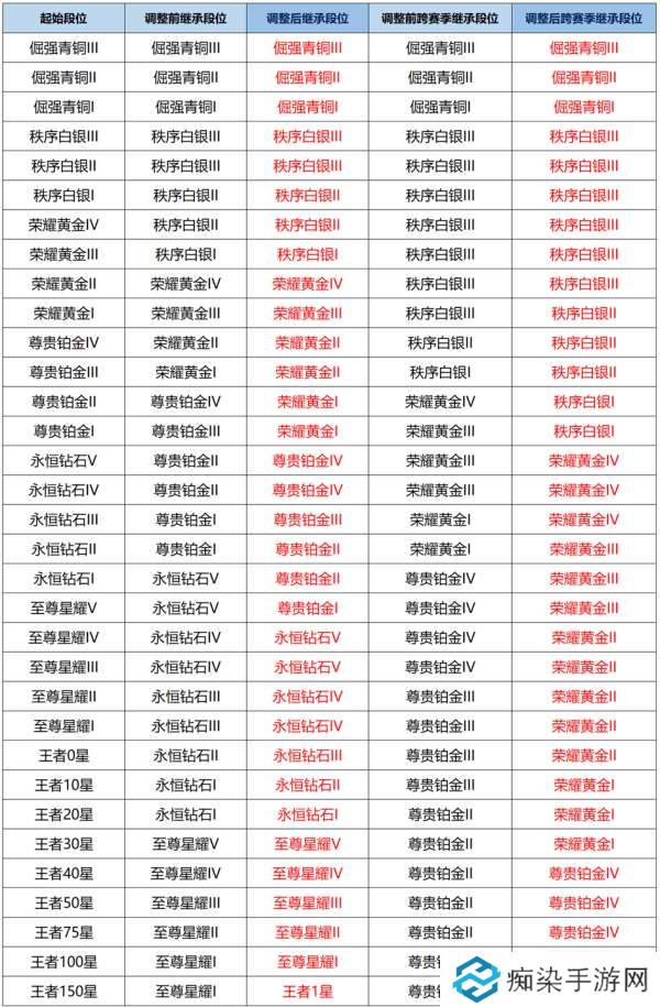 新赛季更新后,调整了起始段位为尊贵铂金II~荣耀王者150星及以上的段位继承方式。