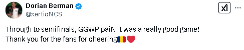 xertioN:成功晋级半决赛,GGWP paiN,这是一场非常精彩的比赛!感谢粉丝们的热情支持!