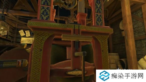 10、将机关部件嵌入小房子中,向下拖拽,进入下一层,拖拽木偶左侧的把手,打开木偶手中的盒子,得到射手座圆片。