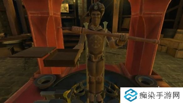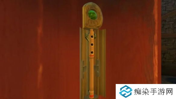 13、拉动左侧柱子中的把手,拖拽木偶右侧的把手,把木质毛笔放在人偶的手中,点击机关上的红色宝石,得到半截笛子,移动机关里的滑块,得到迷你钥匙。