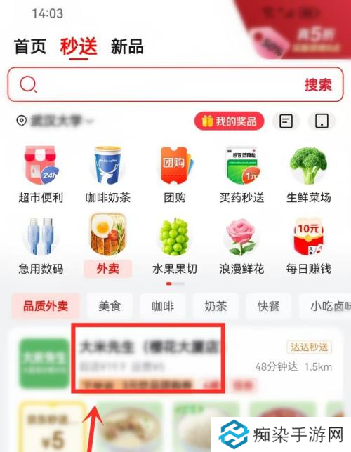 2.、在秒送页面,迅速找到并点击【外卖】选项。