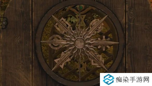 10、再次回到过去,把轮盘放置在铁门中,根据铁门上的空心圆环调整轮盘,记住右侧门上眼睛的方向。